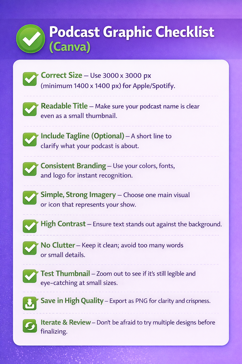 🎙️ Podcast Cover Art Checklist — Make Your Show Stand Out!✅ Correct Size: 3000 x 3000 px (minimum 1400 x 1400 px) for Apple & Spotify✅ Readable Title: Make sure your podcast name is clear—even as...
