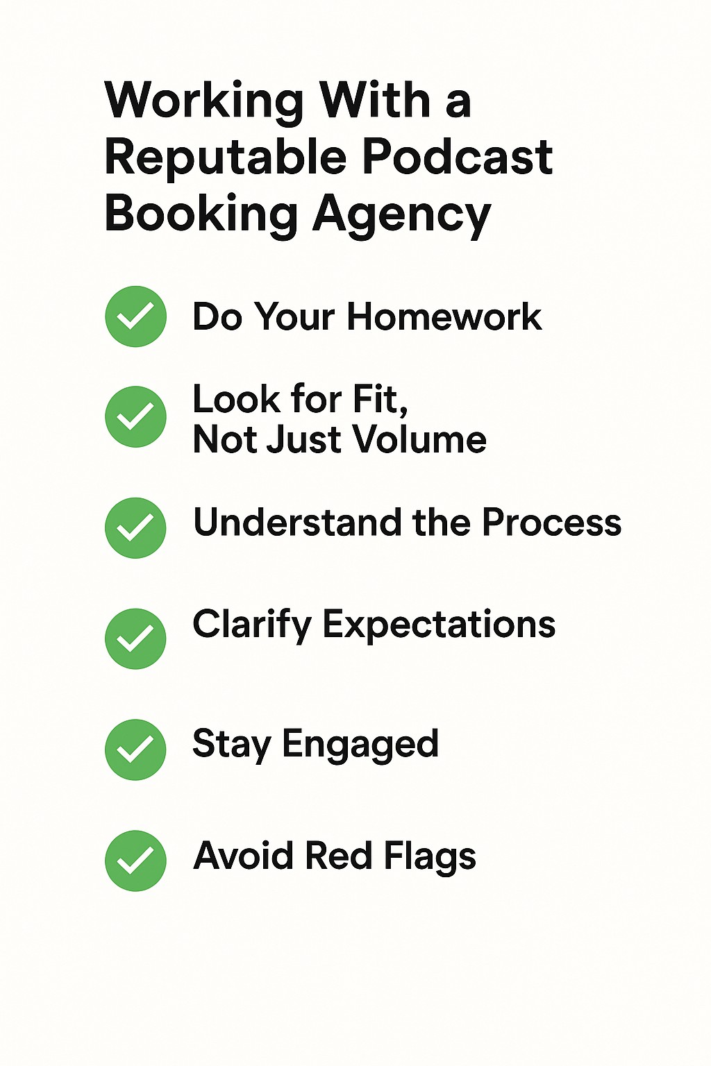 I’ve worked with countless podcast booking agencies and PR companies over the years, and I’ve gotten to know them very well. I also know which ones you should never work with. I won’t name and shame publicly, but if you’re having doubts about a particular agency or rep, feel free to send me a PM. I’ll simply respond with a yes or no—nothing more.